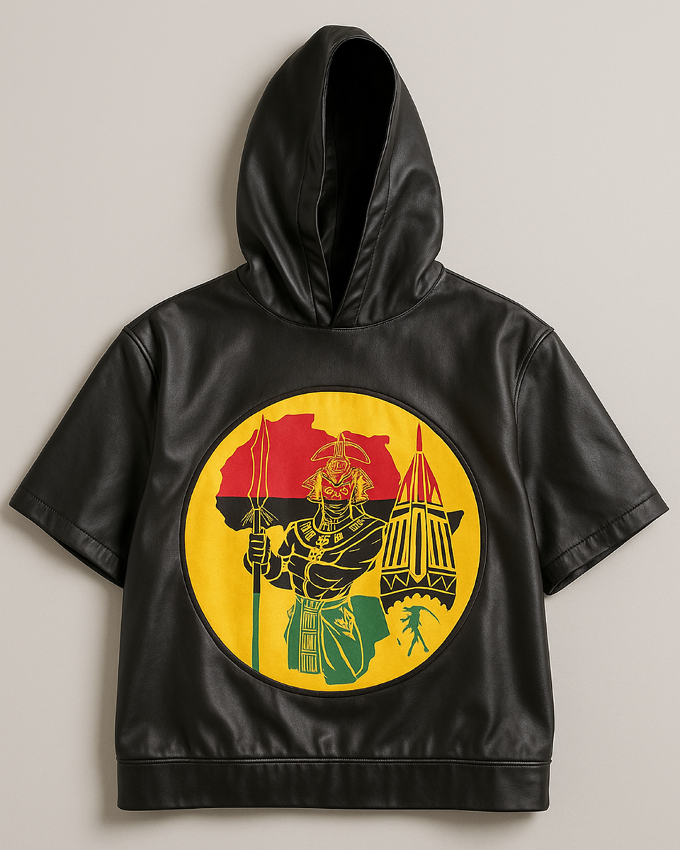 Afrocentric Leatherette Hoodie by Gunner Doyle | Exclusive 1-of-1 Sample, Gently Worn